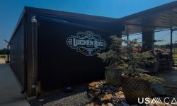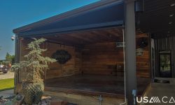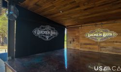 USA Canvas provided the automatic curtain at Lucken Bo’s in Argyle, TX. This drop screen had a custom logo added to both sides of the Sunbrella Black canvas. There also was a custom filler fabricated & installed above the drop screen to fully cover the left side of the stage. The retractable curtain has a fully encased system that can be triggered by remote control or wall switch. Additional sensors are available, check out our retractable section for more.