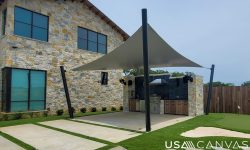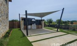 USA Canvas teamed up with Holmes Builders to install a one-of-a-kind Waterproof Shade Sail in Southlake, TX. Unlike traditional shade sails that use permeable fabric, this innovative design features Serge Ferrari Soltis Proof 502, a waterproof vinyl material. This unique choice ensures both sun and rain protection, making it a versatile addition to any residential patio or backyard. The project showcases our ability to adapt and provide customized solutions that meet specific client needs.