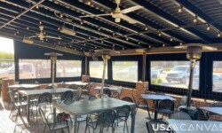 Liberty Burger is a family owned, Texas based company, just like USA Canvas. Their patio at the Richardson location was in need of some curtains to help protect their customers from the changes in weather. USA Canvas fabricated & installed roll up curtains with vinyl windows using a black Sunbrella® fabric & clear Visilite® vinyl.