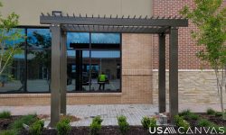USA Canvas custom fabricated and installed metal trellises for the Shops at Frisco in Frisco, TX. These trellis are made from aluminum and will withstand years of weather. They’re great with vines to add a shaded canopy. These were full turnkey by our team in Dallas, TX and were powder coated to finish.